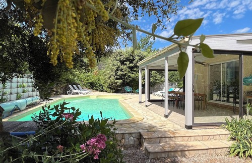 Very nice villa (180 m²) in the heart of « Green Provence” with swimming pool and garden (1500 m²). The charm particular of the garden are the dry-stone walls, the big oak trees, palms and lavender. The beautiful pool with furniture for 12, games for children. The swimmable river “Argens” is near the house (250 m). From the house you have à panoramic view of the valley. The house - construct in 2002 - is completely renovated in 2015 and 2021.