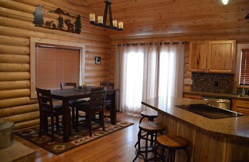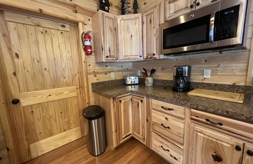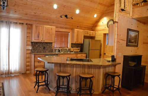 Our cabin has 2 bedrooms and 1 full bath on the main level with an open living room, dining room, kitchen area. There is a loft area upstairs with 2 queen beds and a bathroom with a shower. The kitchen is fully furnished with everything you will need for preparing meals. I have some spices, oil, Pam spray, sugar, brown sugar, flour, etc. I also will try to always have instant oatmeal, pancake mix/syrup, little boxes of cereal and hot chocolate, coffee. At least something to get you started if you get in late. You are close to restaurants a few within 5-10 minutes and many options 10-35 minutes away. There is the Robins Roost grocery store about 10-15 minutes away.