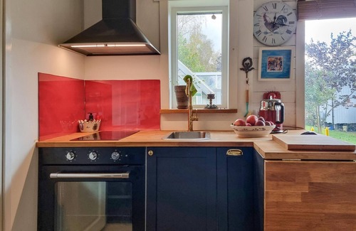 Look forward to your next holiday in this holiday home in Härryda, idyllically situated between meadows and forests. The house offers you a cosy living atmosphere in which you will immediately feel at home. The living room is creatively furnished with colourful artwork and comfortable seating, ideal for relaxing or socialising. Use the inviting kitchen to prepare a delicious meal after an active day. The view of the green garden through the large windows is a delight.