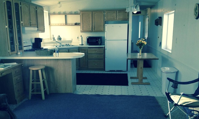 The mobile home has two bedrooms. The master bedroom has a queen sized bed. The master bathroom is located next to the master bedroom. The other bedroom has a twin sized bed and has a half bathroom adjacent to it. The kitchen is equipped with a coffee maker, microwave, refrigerator, stove, and dishwasher. The living room has various chairs and a TV. There are no laundry facilities. The property has plenty of outdoor parking, but a garage and public transportation is not available.