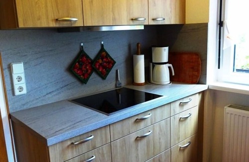 The comfortably furnished, fully renovated apartment is provable from 1-3 persons. Price number of persons. First floor, separate entrance. A spacious hall with shoe rack and wardrobe welcomes our guests. The fully equipped, fitted kitchen with plenty of storage space, dishwasher u. v. Extras, invites for cooking and Vesper set up. In the living room with sitting area one stays like the feasting, or to make yourself comfortable on the couch. to read a good book from the bookshelf full to bring a fun game out of the closet, or to relax just in front of the LCD satellite TV. On the outdoor area, it is great to sunbathe on loungers or have breakfast on the garden seat set in good weather, with a beautiful view of the pleasant green of meadows and forests.