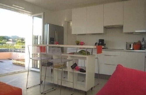new apartment and designer interior: private terrace with magnificent view of the vineyards and the village of Grimaud.