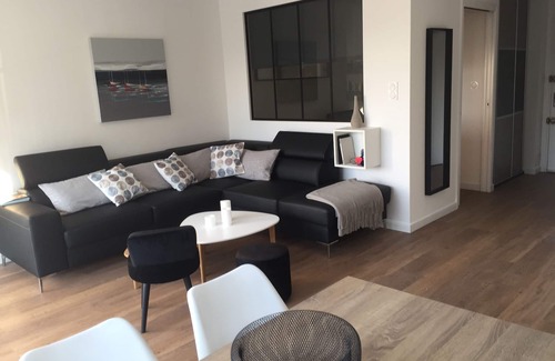 Located in the Morbihan, on the peninsula of Quiberon, 100m from a sandy beach, a golf course, in front of the thalassotherapy institute, on the 2nd and last floor of a secure residence, apartment luminous of 46 m2 entirely renovated composed of a room (bed 140x190), room of water, cupboard, living room stay (sofa bed 140x190) opened on done up and equipped kitchen (lava crockery) giving on a balcony displayed south giving a glimpse sea . TV (international channels), WIFI connection.