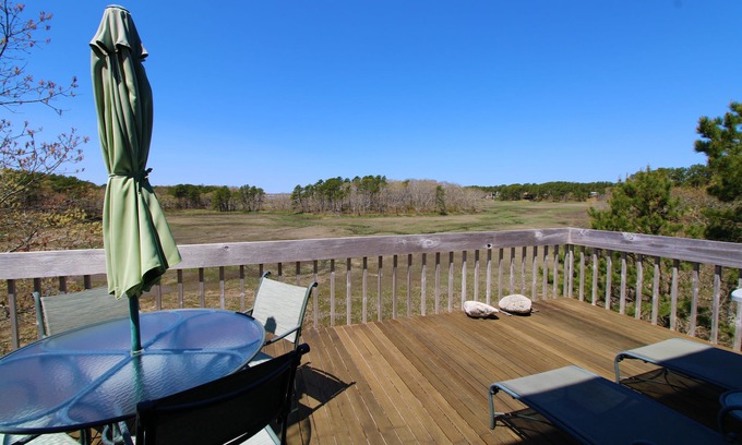 Built in 1978, this contemporary style cottage looks out onto a tidal estuary in the Lieutenant Island Road area of Wellfleet. The house is bright and open and nicely furnished and well equipped. The kitchen, living room and dining area along with a bedroom with a king bed and full bath make up the main floor. On the second level an open loft has two twin beds along with a sitting area. Sliders from the living area lead to a large deck and the beautiful views of the changing tides on the salt marsh. It is a 5-10 minute drive to Wellfleet Center and the beaches at the ocean, the bay and the ponds. An administrative fee and applicable taxes may apply. Linens are not provided—guests may bring their own or rent. This property does not have air conditioning.