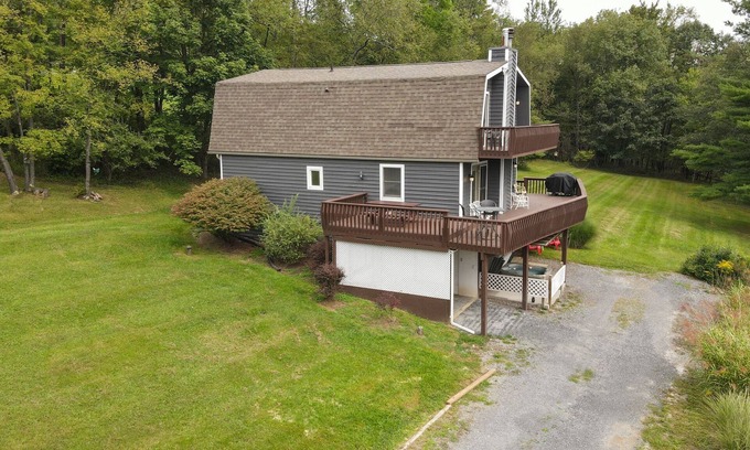 Nimba Cabin is waiting for you! Enjoy this mountain chalet perched on a hill overlooking the valley below! As you approach this unique home relaxation will be on your mind from the expansive views, quiet community, and open spaces, while fun is just around the corner at the Deep Creek Lake access area and all the resort’s activities. An expansive and slightly sloped grassy yard surround this home to give you the feeling of wide openness with the perfect amount of trees lining the property. As an added bonus, this home is located in the Paradise Point subdivision which has a beautiful level lake front area with plenty of parking, two pavilions, picnic tables, sandbox, spacious grassy lawn, and a canoe and kayak station just a short drive away. Soak up the sun, wade into the lake from the shore, swim or fish off the community docks, or just take in the beautiful view down the body of Deep Creek Lake. Plan your Deep Creek Lake vacation today, no matter the season there’s always a reason to visit!