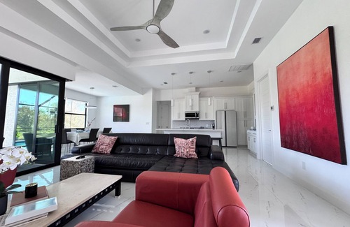Discover luxury and romance in this new construction home with stunning golf course views. Features a heated private pool, modern Italian design, and high ceilings with hurricane-proof windows that brighten the spacious interiors. Ideal for couples seeking a sophisticated yet cozy sanctuary. Enjoy the tranquility and privacy of this exquisite location, where every detail celebrates comfort and elegance.