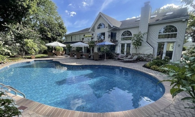 5 BR as well as a sofa bed off master bedroom. 6100 sqft, billiards room, formal dining room, large family room with fireplace, living room on main, main floor bedroom with handicapped bathroom accessibility,30 foot ceilings on main level living room second floor. 18 foot ceilings on second floor very palatial looking home outside has 3000 square-foot patio with built-in pool and pavers backyard is approximately 115 feet wide by 170 feet deep very well landscaped with trees and lots of flowers parking in driveway centrally air-conditioning, heated pool Wi-Fi Internet three large screen TVs ready for a small gathering only 26 miles from New York City only 8 miles to beaches less than 10 miles to airport and only 56 miles from the renowned Hamptons and only 2 1/2 drive to Atlantic City New Jersey or airway available for a half hour flight done. This home was newly renovated and decorated. Small parties are permitted but no large gatherings allowed. No pets, non smoking home.