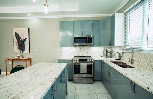 A brand new building in the ‘Golden Triangle’ of Kingston, guests can expect a rooftop pool, walking path, and gym with gorgeous views of Kingston Harbor and the surrounding hills of St. Andrew. The Chateau apartment has an open floorplan and a modern-contemporary in design, all with your comfort in mind. Everything, from king pillow-top mattress, luxury sheets and towels, high end Cafe and Electrolux appliance, comfortable stylish furnishings. You have a responsive team to ensure you have an amazing experience.