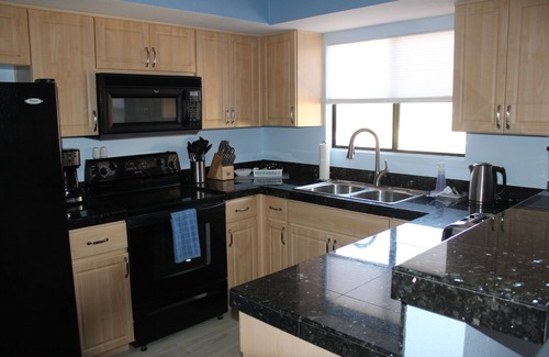 - A fully stocked kitchen with utensils, pots and pans, dishes, mugs, glasses, baking dishes, storage containers, coffee maker, toaster, blender, tea kettle and microwave