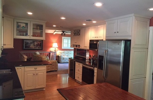In the Gruene River Home, the Main Ground Floor Level includes the Living Room, a fully-furnished Gourmet Kitchen, and the Master Bedroom with Bathroom. The Master Bedroom has a full Bathroom, and will accommodate up to 3, with the King-Size Bed, and a Single Pop-Up Trundle Bed beneath it. The Living Room has 2 leather sofas that can each accommodate a smaller adult, an adolescent, or child, with all Bedding and Pillows provided. All rooms have Guadalupe River Views, and open to the Kitchen and Living Room.