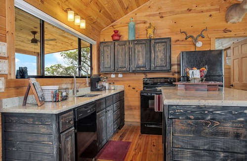 As you step into the cabin you will appreciate the open, spacious floor plan. The combination space offers a beautiful king size bed with luxurious linens as well as a comfortable sitting area. From either area you can enjoy the 37" high definition flat screen television. This space opens into the full kitchen, perfect for putting together a quick meal. Or step out onto the fabulous deck and grill some steaks on the infrared gas grill.