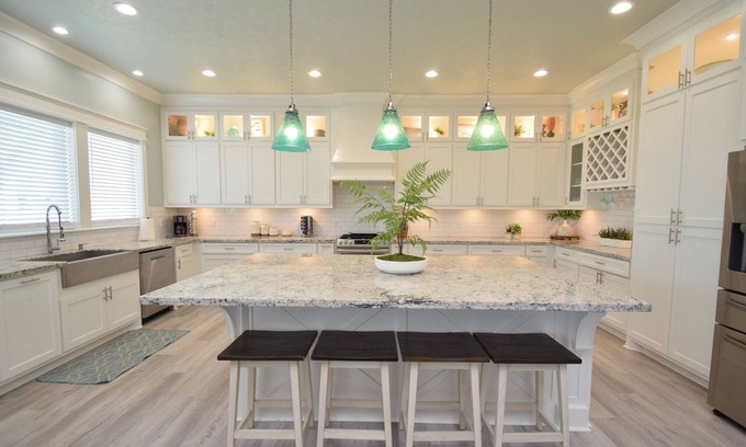 The beautiful kitchen is well stocked for your family's chefs to show off. It offers a gas range with griddle top in the middle, double door fridge with a storage drawer, dishwasher, ice maker, and counter top dining for 4.