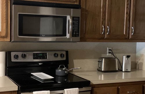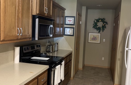 1 car garage, 2 bedrooms w private full bathrooms. Large full kitchen. Large leather sectional. Vaulted living room ceiling. Small outdoor deck, and a very small side yard. Washer and dryer included.