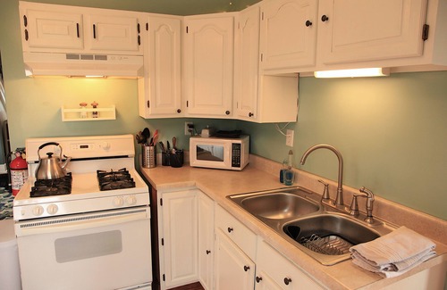 Downstairs, there is a comfy couch and Smart TV in the front room, as well as a vintage stereo console, which the AM/FM radio works. There is a big table in the dining room, and seating in the parlor. The kitchen has a bar for more seating and viewing wildlife, as well as a gas stove, kettle, microwave, coffee pot, espresso machine, French press and items you will need to cook and eat meals.