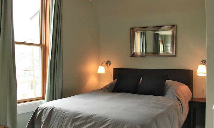 Step back in time in this bright and thoughtfully preserved space with maple hardwood floors, velvet curtains, a claw foot tub, and porcelain door knobs.