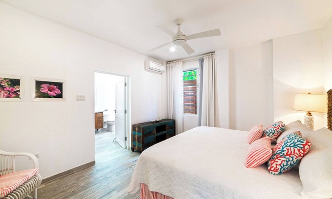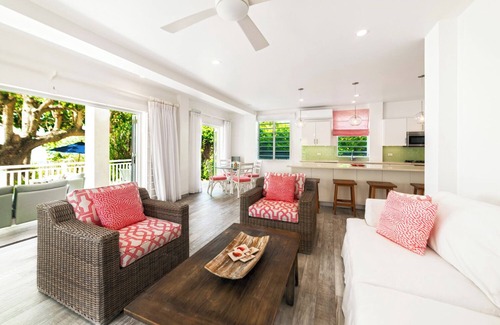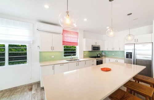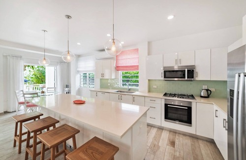 The middle unit “Green Monkey” (named after the infamous Barbados green monkey which can be seen at the Barbados Wildlife Reserve in St. Peter or on any mango tree around the island) offers 3 bedrooms 2.5 bathrooms (one en-suite), open plan living and dining room, kitchen and patio.