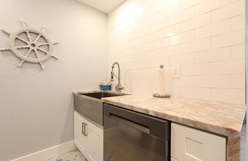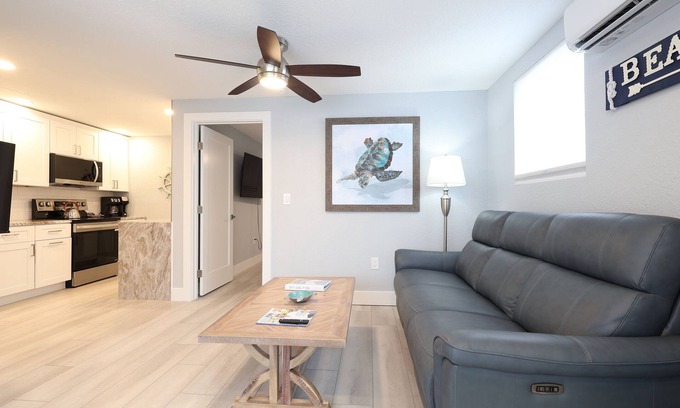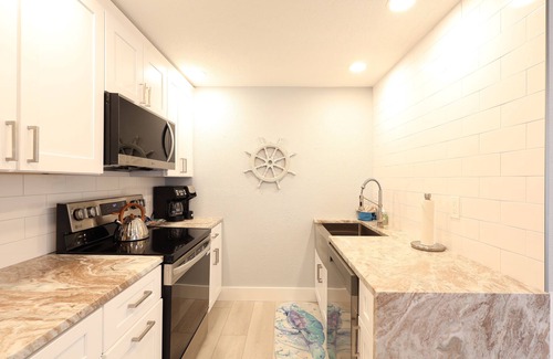 This is a ground floor, one bedroom, one bath unit with King-size Serta ICOMFORT CF 3000 Memory Foam Gel Series bed in the master and full bath off of the bedroom, ensuite. Large walk-in tile shower with glass enclosure.The Nook features a fully equipped kitchen with granite counter tops and cozy dining area and beach chic laminate wood flooring throughout. This unit is naturally bright and spacious, with white-washed tongue and groove accent walls. Enjoy a flat screen, 55 inch TV in Living, DVD player and a flat-screen TV in master bedroom. Relax in the lovely outside garden area off the front entry, with table and chairs and extra seating for guests. This is a dog-friendly unit, but dogs must be approved by the office before booking. There is a dog fee placed on the reservation. (Maximum 2 Guests).
