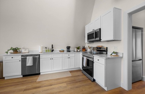 As you come in the front entryway, on the right is the laundry room, and on the left if the Queen bedroom with a Smart TV and walk-in closet. Directly across from the bedroom there is a full bathroom with a standing tile shower. As you continue down the hallway, you will find the open concept living room, kitchen and dining area with vaulted tongue and groove ceilings and instant views of the mountain scenery. Through the sliding glass doors is the back balcony deck with plenty of comfortable seating, a gas fireplace, and more tongue and groove wood walls and ceilings. Up the stairs you will find a cozy King loft bedroom with an ensuite bathroom, standing shower, and closet space.