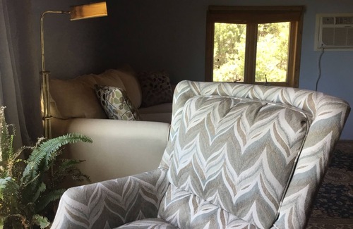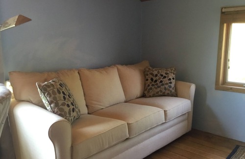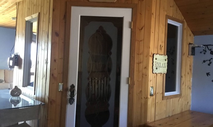 Large room with scandinavian motif. Rosemaling details on a mora clock and side chairs. One queen bed and one pull out sofa bed. private bathroom in the room. sauna. air conditioner. wifi, parking in front. electric fireplace. tv with roku.
