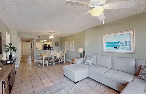 Our home consists of a guest bedroom with a queen size bed, hall bathroom with combination tub/shower, master with a king size bed, with shower only and access to the covered patio/balcony, a sleeper sofa in the family room and a fully equipped kitchen with dining for 6 guests.