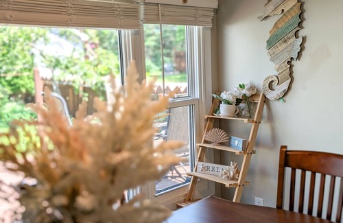 Unwind in the living room with seating for five and a large flat-screen TV. The spacious master bedroom features a luxurious king-size bed and walk-in closet, while the second bedroom boasts another king-size bed. There is a full bathroom with shower/tub combo upstairs and a half bath downstairs. Parking for two vehicles is available in the driveway, additional street parking available as well. Head out to the backyard and enjoy outdoor seating, a garden view, and a path to the beach. If your looking for a beach outing take full advantage of the shared paddle-boards and kayaks located down the beach path at the neighboring property. This house is perfect for a romantic getaway to the beach, a fun family outing, or even just a weekend with your friends.