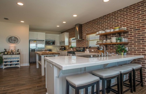 A great beach house has to have a spacious living area, and we created one with spectacular views from all around, not to mention plenty of room to hang out, play games, dine in, or just relax and watch a good movie. It has a beautiful fireplace, big screen smart TV, bluetooth sound bar speaker, and dining room table for 6 with additional seating for four more at the kitchen counter.