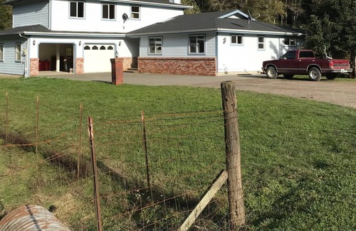 This 2800 square foot farm house is located on the North Fork Chetco River. As a tributary of the Chetco this river is more of a large creek. There are deep pools but more wading areas for small children. With a mile of river frontage guests can wander along river up or down. From the north bank Chetco river road guests drive on 3/4 mile of flat gravel through farm buildings, river bottomlands, and myrtle wood groves to their secluded destination. Pastures house horses that are boarded on the premises in one of the many barns. Scottish Highland cattle reside in the fields bordering the house. In the summer orchard trees are right off the deck for picking apples, plums and pears. Built in the early 90's, this home boasts an updated kitchen and a game room complete with custom bar and pool table overlooking farmland in every direction. Wood floors, large windows and vaulted ceilings in living room look out over deck and river. This home’s unique offerings are the serene river view and access with complete privacy while being 8 flat miles from town, beach and hubbub. Come stay for a peaceful and relaxing retreat.
