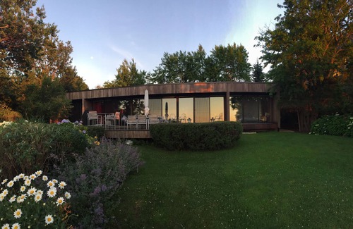 Designed by renowned architects Abercrombie & Vieyra for their private use, this 4 bedroom, sound front home with a private beach is a dream come true. Only 7 minutes from Greenport & close to the amazing vineyards and farm stands of the North Fork, this home is the perfect getaway, and a real treasure for those with an appreciation for architecture and design.