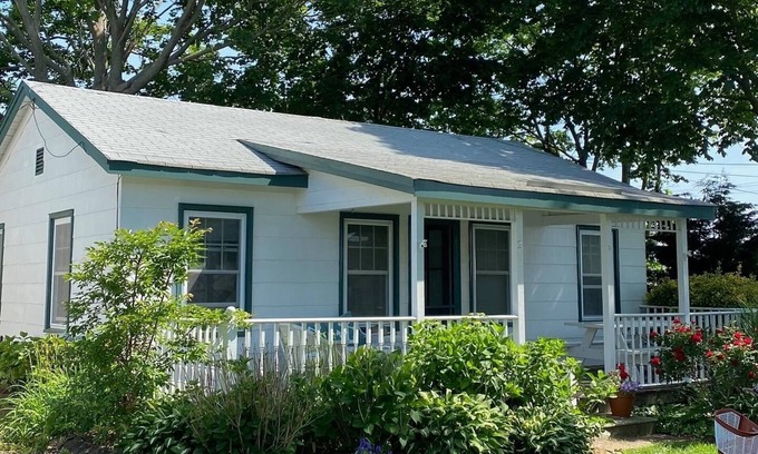 This two bed/one bath cottage has a private outdoor porch, and is designer-appointed with a mix of new and classic vintage charm. Spacious living room, one queen bed and two twins, country kitchen, TV, Wifi, and AC. Mature gardens. Country green with picture-postcard views of the beach and harbor. One Block from two local restaurants, antique store, fresh oysters and more. Preserved by New Suffolk Waterfront Trust.