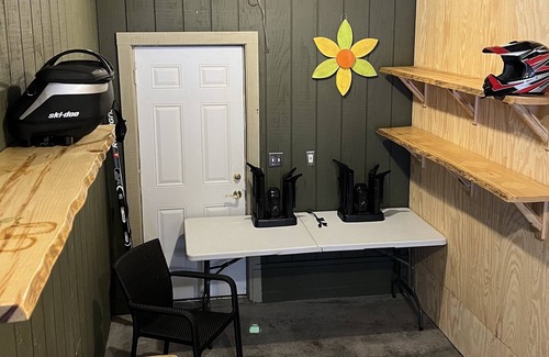 Newly added breezeway off the kitchen has ample space for all of your gear. This heated space is great for changing out of your snowmobile gear after a cold day out on the trails. Outfitted with shelves for helmets, hangers for your coats & bibs, and boot dryers if needed.