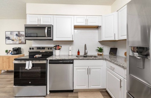 Guests may park on the street, the driveway, or in the attached single-car garage with a provided remote opener. On first arrival, you’ll enter through the front door with a keypad lock. Throughout your stay you may use the front door or the garage door. Both entrances lead to the brightly-lit living room with a stylish sectional sofa and 50” smart TV. Down the hall you’ll find a newly-renovated full bathroom with tub/shower combo and two relaxing bedrooms featuring comfortable beds with fresh sheets, extra blankets, black-out shades, and clothing storage.