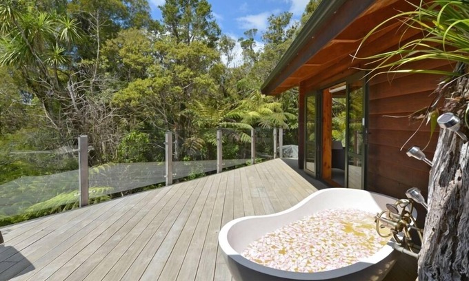 As the evening closes and you're relaxing in the outside bath on the deck with a wine, you may spot glow worms flickering among the foliage, or hear the kiwi bird calling.