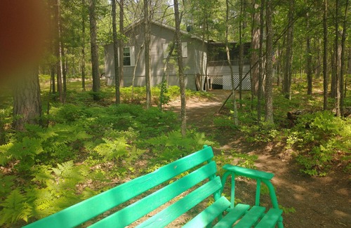 On nearly 3 acres, sharing an 11 acre tract with only one other (family member). Wonderful privacy, really wonderful lake for swimming or fishing; beach along the shore for swimming (depending on high-water level); 30-foot dock for boating (public boat ramp on the south end of the lake, a mile down the trail). Fire-pit by the shore (wood provided). Hiker-friendly woods. Cute squirrels and chipmunks; deer in the yard are not unusual. House has a great kitchen, open floor plan, much new carpet, new vinyl floors in kitchen, bath, utility, central heat and air conditioning; unlimited high speed wifi internet, Roku for two TVs, or watch DVDs (provided, some), or bring your own game console. Two full baths, 3 bedrooms, big screened porch for additional space, gas barbecue grill (gas provided). Handicap accessible. 14 foot aluminum boat with 6 hp motor (fuel provided); 12' canoe, hard SUP board, inflated two-person kayak.