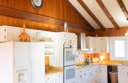 There's lots of space to explore outdoors! Maybe you'll find the freshwater spring that's onsite? A wooden split rail fence creates boundaries around the homestead, keeping everyone safe. A flagstone patio is just off the Great Room, where the lovely evening shade makes it enjoyable for an al fresco dinner. A gas grill is available to use.