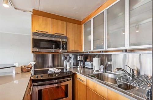 This freshly renovated unit is modern, clean, and comfortable. Featuring a private bedroom with a plush queen bed and a queen pullout sofa in the living area, everyone is ensured a restful night's sleep after a day of exploring. The open-concept living space invites you to unwind and enjoy quality time together while soaking in spectacular views. The fully equipped kitchen makes meal preparation just as easy as when at home. Enjoy your culinary creations at the dining table or dine al fresco overlooking the mountains on the spacious deck that spans the whole length of the condo. The comfortable living area comes complete with a Smart TV, cable, and free Wi-Fi for your entertainment needs.