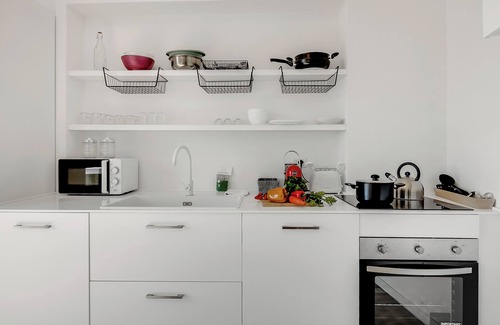The balcony is thoughtfully furnished with tables and chairs, making it an ideal setting to enjoy a morning coffee or a peaceful evening drink. Inside, the open kitchen is fully equipped with modern amenities, including an induction hob, a drip coffee machine, an electric kettle, a microwave, a dishwasher, an oven, a toaster, and a fridge with a freezer, ensuring a convenient and comfortable stay.