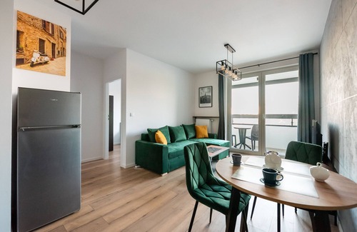 Nova Sfera Green Apartment features a stylishly furnished living room with a sofa bed and a kitchenette, a bedroom with a comfortable king-size bed, and a bathroom. Guests have access to a range of practical amenities, including free WiFi, cable TV, an iron, washing machine, hair dryer, refrigerator, oven, dishwasher, kettle, and kitchen accessories. Completing the offering is a spacious balcony with outdoor furniture, where you can enjoy your free time. The apartment also includes a parking space in the underground garage.