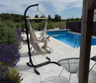 Offering a garden, Nowa Stodoła Koniec Świata offers accommodations in Mikołajki. Guests can benefit from a terrace and a seasonal outdoor pool. Święta Lipka Sanctuary is 23 miles away and Tropikana Aqua Park is 4.5 miles from the apartment. The apartment is composed of 1 bedroom, a living room, a fully equipped kitchenette, and 1 bathroom. A flat-screen TV is featured. The accommodation is non-smoking. Sailors' Village is 5.4 miles from the apartment, while Mrongoville is 11 miles away. Olsztyn-Mazury Airport is 47 miles from the property.