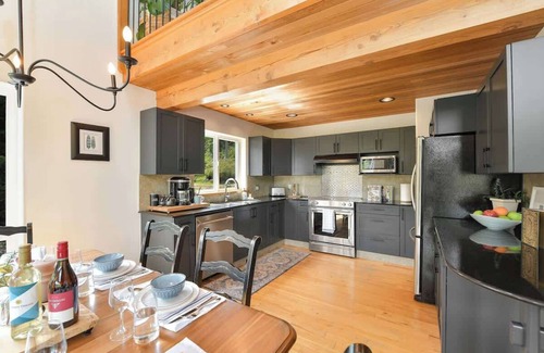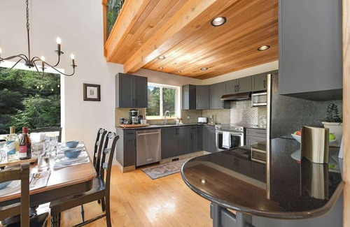 As you enter the home, you'll be greeted by a vaulted ceiling open-plan living, dining, and kitchen area. Large windows flood the space with natural light and offer stunning views of the surrounding forest. The living room, with its cozy wood stove, provides a perfect spot for relaxation. The well-appointed dining area seamlessly connects to the outdoor decks, perfect for al fresco dining, while the fully equipped modern kitchen ensures that the chef in your group has everything needed to prepare delicious meals.