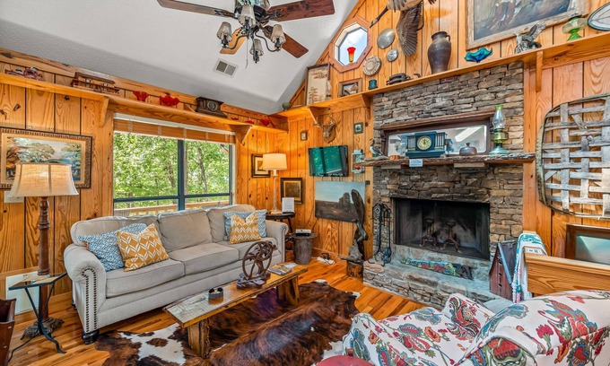 Enter our ROMANTIC MOUNTAIN TOP TREE HOUSE through a PRIVATE GATED ENTRANCE to a WORLD OF LUXURY & COMFORT! The cabin has long range 180 degree views from every room. A wall of glass opens onto a 30 foot balcony for relaxing, star gazing & enjoying your favorite beverage. It is fully furnished with antiques, fine linens, original art, pottery and art glass. There are soaring cathedral ceilings & an open floor plan, stacked stone fireplace, wood walls throughout, oak hardwood floors, flat screen television/satellite with DVD, fully equipped kitchen and much more . LOCATED ON THE EDGE OF LOOKOUT MOUNTAIN! Minutes to all area attractions.