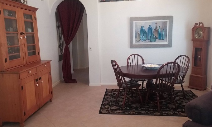 Our 1812 square foot adobe style home has 4 bedrooms, family room, 2 full baths, and a living/formal dining room. It features cathedral ceilings and arched doorways. It is the perfect home for couples, families/friends, and comfortably sleeps up to 6 with a Full (2) in the first bedroom, a Queen (2) in the second, and a Queen (2) in the Master. The fourth bedroom has a fold out couch and is used as a Sitting room. There are two full baths and a Garden tub in the master. The home has a block fence around the entire backyard, and a brick patio. You may read from our collection of books, watch television/movies, or just relax .