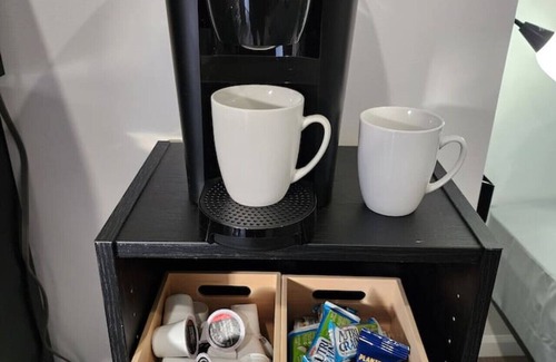 The apartment features queen size bed and a designated workstation, making it convenient for those who need to catch up on work or simply browse the internet. The high-speed Wi-Fi ensures you stay connected throughout your stay. This studio apartment has one bathroom with a standup shower, providing a refreshing start to your day. Fresh towels and toiletries are provided for your convenience. Coffee and snacks provided.