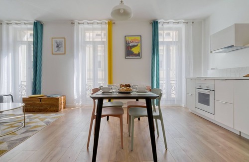The apartment is located on the 1st floor of a building with classical architecture called the 3 windows marseillais. Upon entering you will find on your right the quiet room overlooking courtyard and offering a large wardrobe. On your left a corridor leading to the water rooms (separate toilet) and overlooking a beautiful room with the famous 3 windows and a beautiful open kitchen.
