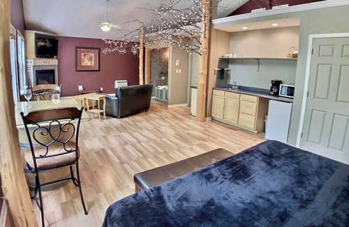 The dramatic cathedral ceilings and wall of windows make it easy to enjoy the beautiful landscape in our quiet and peaceful location. Make yourself at home with the kitchenette equipped with mini-refrigerator, microwave, and coffeemaker. Relax on the loveseat in front of the fireplace, or enjoy a romantic view overlooking the trees. Just minutes to downtown Eureka Springs.