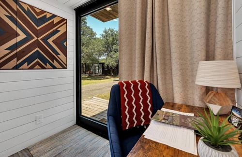 The Oak Harbor at Bluebonnet Trail container house rests quietly in the trees and has all the amenities of an upscale hotel room with a unique design. It hosts a cozy queen size bed, a convenient kitchenette, and an elegant full bathroom with a soothing walk-in shower. Head up to the rooftop deck to relax while stargazing or enjoying your morning coffee.