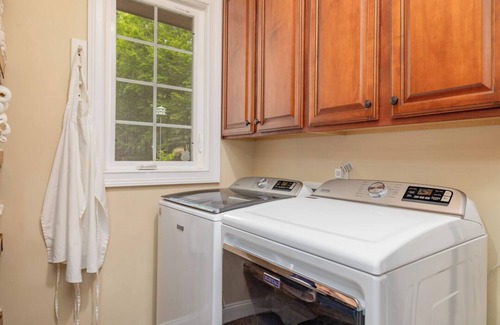 Welcome to Oak Point! Inside on the main floor, the house’s design features an open floor plan, high ceilings, hardwood floors, a modern kitchen, a separate dining area, the living room, the sun room, the primary bedroom with lake views and ensuite bathroom, an additional bedroom with lake views, a newly renovated full bathroom, and a laundry room (with washing machine, dryer, and a sink). The living room features a stone fireplace and fantastic panoramic lake views. The living room is perfect for watching TV on the 65-inch smart TV, playing board games, reading, listening to music, relaxing around the decorative stone fireplace, or taking in the expansive views of the lake. The open kitchen, which is the ideal place for cooking, has a refrigerator with freezer, an oven and gas stovetop, a dishwasher, a microwave, and coffee makers (both drip and Keurig). For meals, you can dine at the 8-person inside dining table, the 4 stools at the kitchen bar, the 6-person table on the outside patio overlooking the lake.