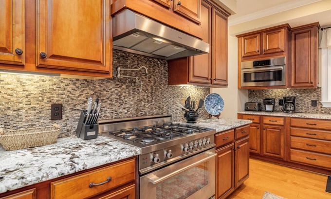 Walking down to the basement floor, you will discover a second kitchen with refrigerator, oven and stove, dishwasher, sink, and microwave. This floor has a second living area with comfortable furniture and a 75-inch smart TV (with Blu-Ray player). There are 3 bedrooms and 2 full bathrooms on this level.