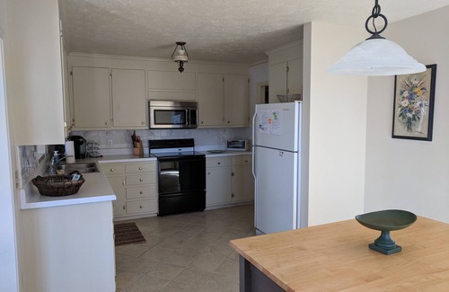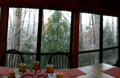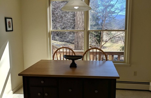 The first floor of the house has a living room, a full kitchen with island, a large dining table with seating for nine, a glass-walled room that provides a full view of the forest, as well as two bedrooms and a full bath. On the second floor, there are two more bedrooms and another full bath. The house has hot- water baseboard heat. We also have a private pool available for the use of our guests. There is no lifeguard on duty.