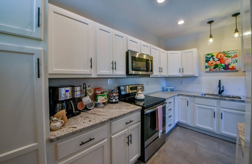 Upstairs there are three more bedrooms and bathrooms. The floor is separated into three different apartments. Each apartment has their own bedroom, bathroom, kitchen, and living space. Each apartment is equipped with kitchen and coffee supplies, so all guests can stay caffeinated during your stay! With three couches on the upstairs floor, there will always be a spot to relax and watch tv, play games with family and friends, or chill before going into Downtown Tuscaloosa for a night out!