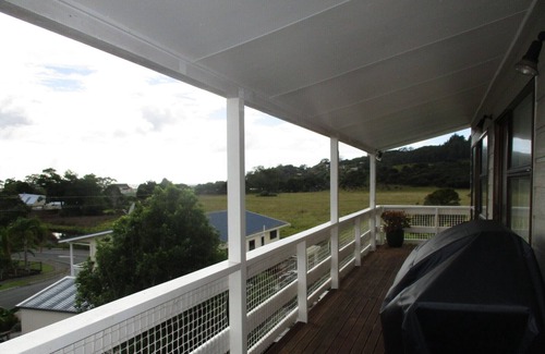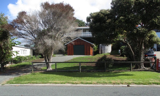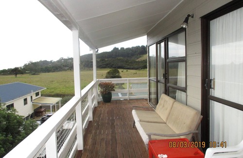500 m to beautiful sandy beach. Large, elevated balcony with sweeping ocean and village views. Covered viewing platform above the bach. Two convenience shops within walking distance, one of which sells petrol and diesel.
